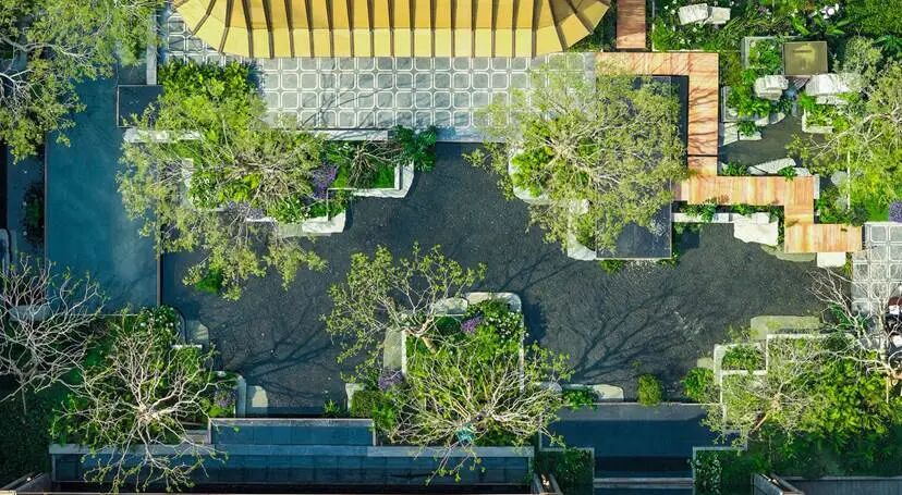 其灵感源泉——崇州罨画池,不是被做成一个中式园林,而是被解构、提炼为现代空间的语言。