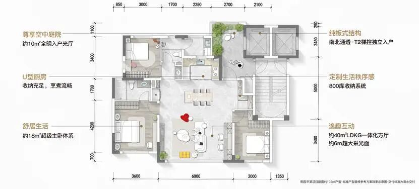项目建面约103㎡户型·标准户型装修参考方案效果示意图·交付标准为清水交付