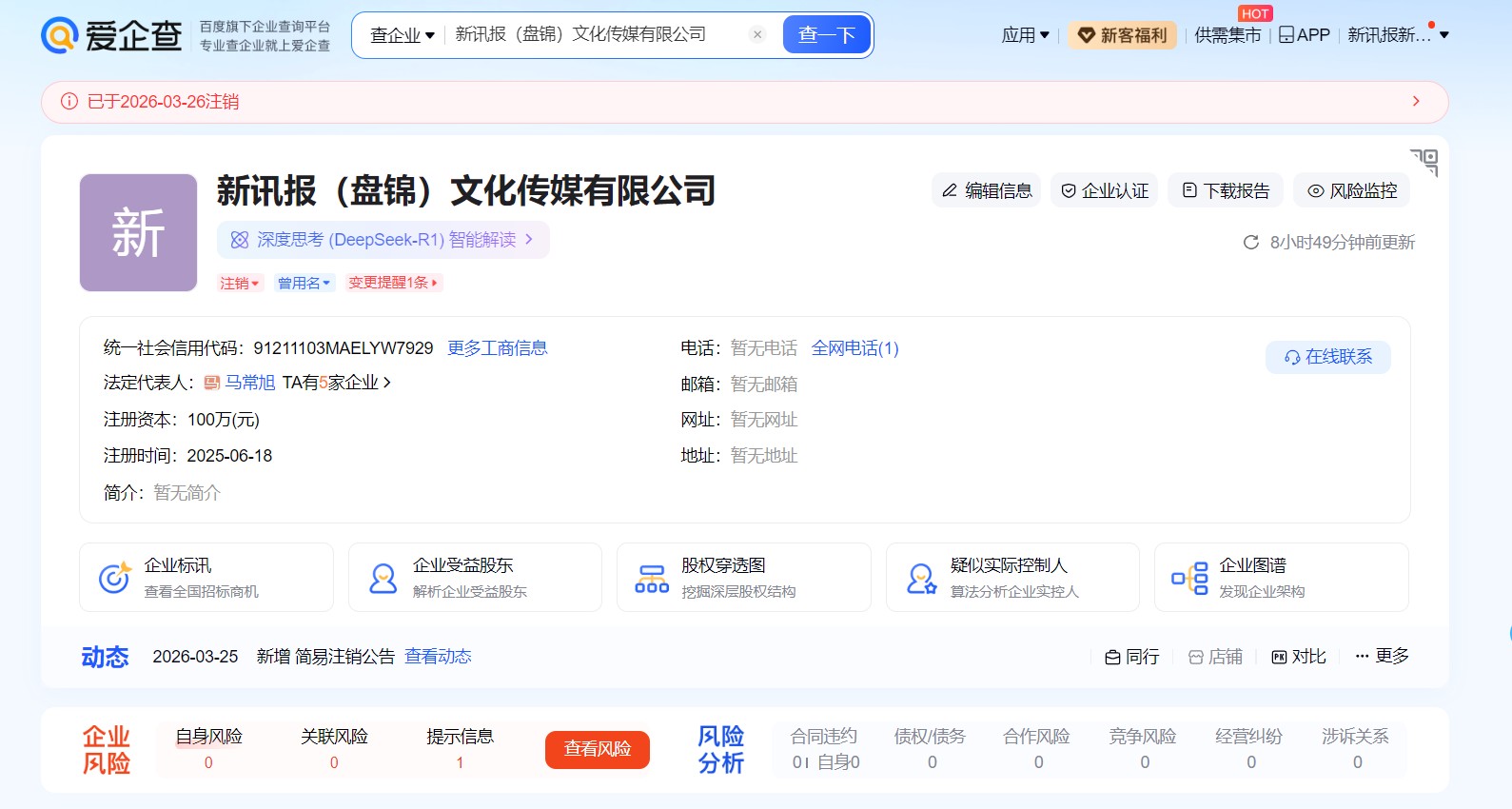 近日,据爱企查官网显示,新讯报(盘锦)文化传媒有限公司已于2026年3月26日注销,法定代表人为马常旭。