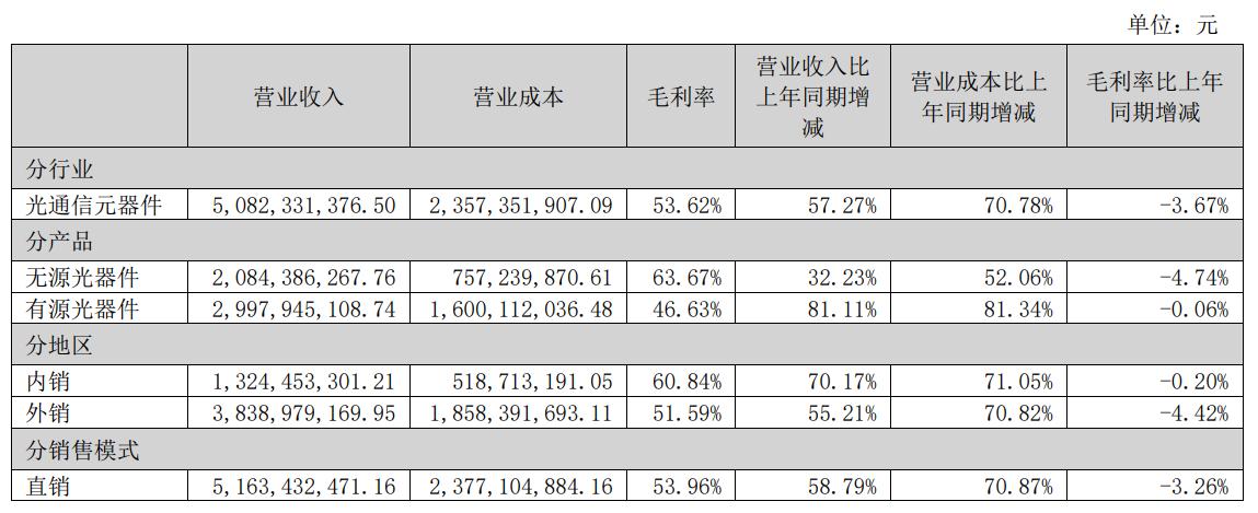 2025 年,天孚通信光通信元器件营收50.82 亿元,占总营收99.38%,同比增长57.27%;其中有源光器件营收29.98 亿元,同比大增81.11%,成为业绩核心增长引擎。公司毛利率维持53.96%高位,无源光器件毛利率63.67%,有源光器件毛利率46.63%,盈利能力远超行业平均水平。