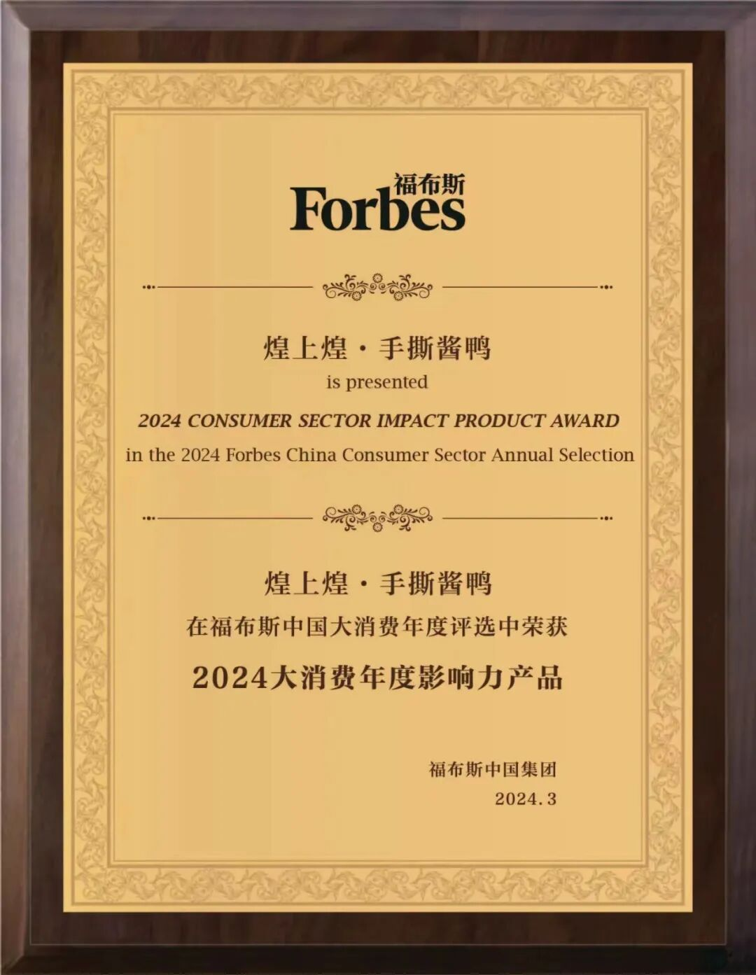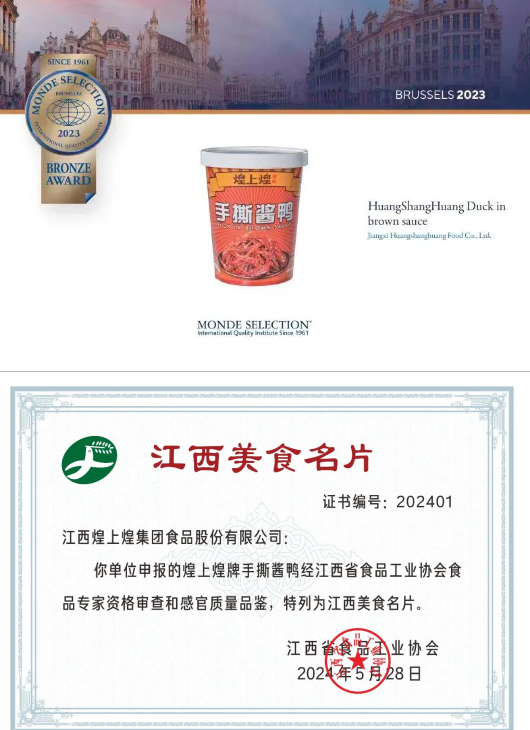 作为酱卤行业的领军企业,煌上煌自创立以来始终坚守匠心精神,深耕卤味领域三十余载,将传统酱卤技艺与现代科技深度融合,打造出深受消费者喜爱的产品矩阵。其中,手撕酱鸭作为煌上煌的明星产品,堪称卤味行业近20年来的一次重大产品创新。该产品选用国家地理标志产品——鄱阳湖放养的红毛麻鸭为原料,采用省级非遗酱卤技艺,配以28味植物香辛料,历经32道秘制工序、72小时超长酱卤,通过滚揉腌制、烘烤、独家秘制酱汤酱制等十余道工序精制而成。上市后迅速热销超1000万份,被誉为“江西美食名片”,并荣获“2023年国际蒙特奖”、福布斯“2024大消费年度影响力产品”、第四届江西生态鄱阳湖·绿色农产品博览会金奖等多项行业大奖。