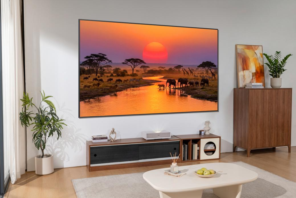形态的消融,则是一场彻底的空间解放。1.7cm的行业最薄机身搭配零缝隙贴墙的安装方式,让百吋巨幕如同“悬浮”于墙面,从物理上显著消解了传统电视的厚重体量与压迫感。“让电视像画一样贴在墙上,不破坏空间的整体感”——这不仅是技术的成果,更是居住哲学的体现:让产品从“占据空间、强调存在”的客体,彻底转变为“释放空间、融入空间、服务空间”的背景。