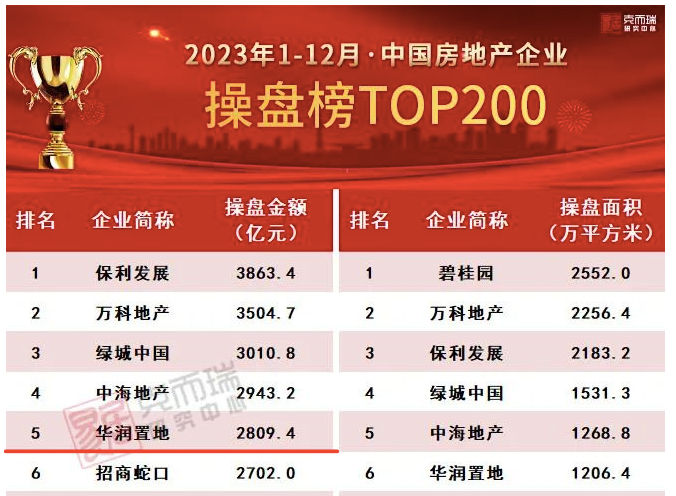2023年,华润置地超额完成全年业绩,以2809亿元操盘金额,名列百强房企TOP5,稳居房企第一梯队。