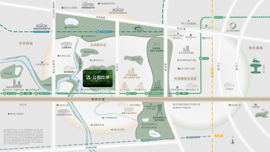 九联|龙湖·公园玖序占位城西新中芯——马厂坝片区核芯,占据双区门户位置,凭借TOD一体化设计与大健康产业定位,享受城市精粹资源。同时紧邻江安河,近享超万亩生态公园体系,蓝绿交织、自然渗透,是真正长在公园里、生在繁盛中的高阶住区。