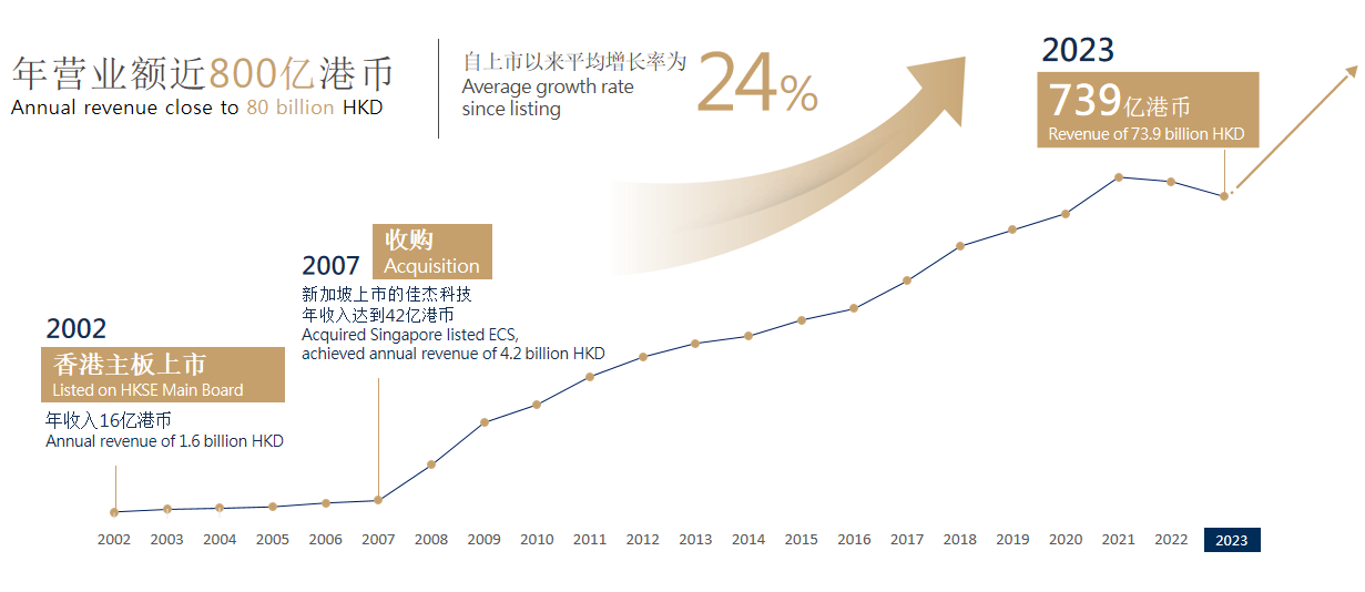 伟仕佳杰是亚太区领先的科技产品渠道开发与技术方案集成服务商,也是科技产品进入中国及东南亚市场的主要通道和主流渠道。自上市以来,伟仕佳杰的经营业绩稳步提升,年营业额由2002年的16亿港币增长至2023年的739亿港币,年平均增长率达到24%,公司的业绩增速全行业第一。