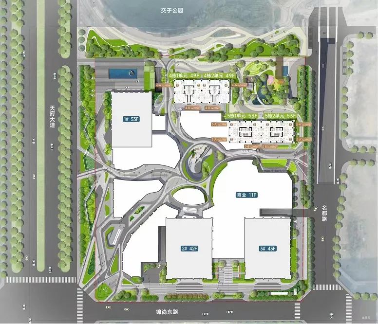 在十年前的当时,交子公园这一稀缺资源对5个业态来说,排序如下:住宅-公寓-酒店-商业-写字楼。所以,在这样78亩,地上建面高达63万平米用地上,占比20%(12.6万方)的住宅几乎占据了项目沿交子公园的整个景观面。