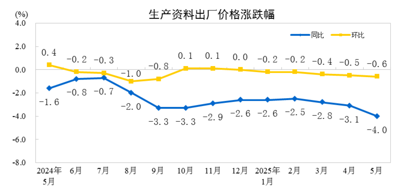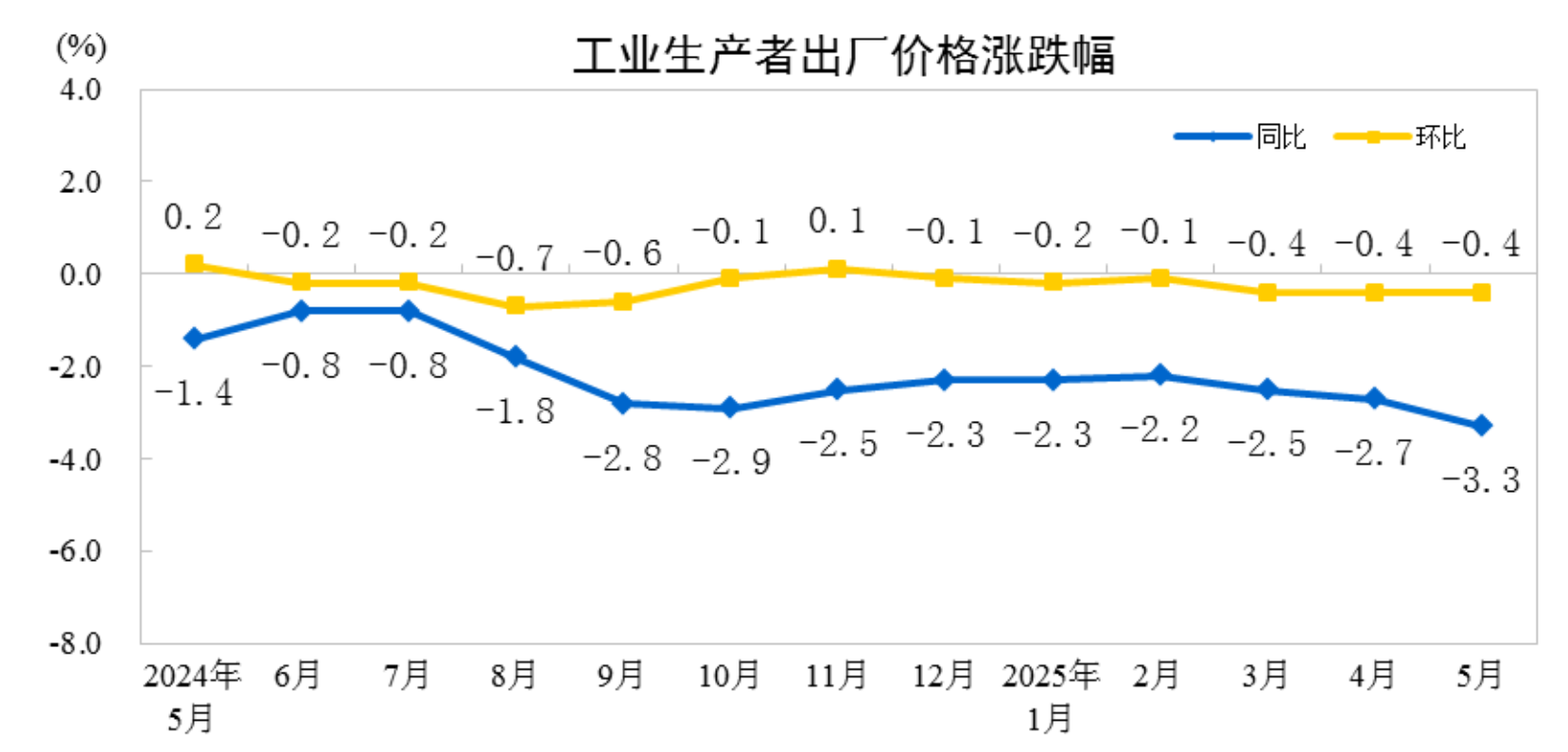 国家统计局6月9日公布数据显示,5月份,全国工业生产者出厂价格同比下降3.3%,环比下降0.4%;工业生产者购进价格同比下降3.6%,环比下降0.6%。1—5月平均,工业生产者出厂价格和购进价格比上年同期均下降2.6%。