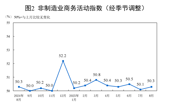 8月份,非制造业商务活动指数为50.3%,比上月上升0.2个百分点,高于临界点,非制造业继续保持扩张。