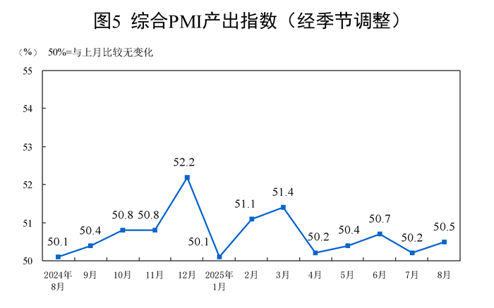 8月份,综合PMI产出指数为50.5%,比上月上升0.3个百分点,持续高于临界点,表明我国企业生产经营活动总体扩张有所加快。