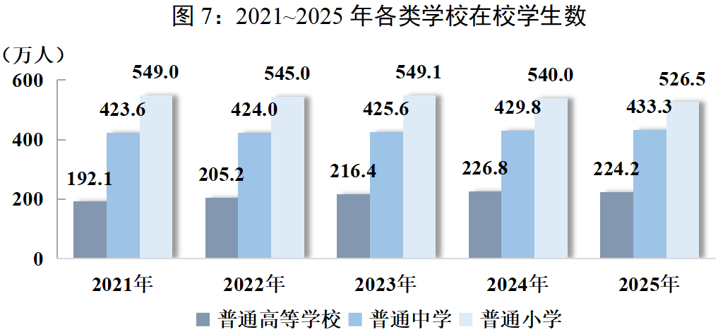 年末共有普通小学4771所,招生79.8万人,在校生526.5万人。普通初中3015所,招生93.0万人,在校生277.5万人。普通高中817所,招生54.0万人,在校生155.8万人。特殊教育学校142所,在校生(含附设特教班)2.1万人。中等职业教育学校(不含技工学校)308所,招生24.0万人,在校生71.2万人。
