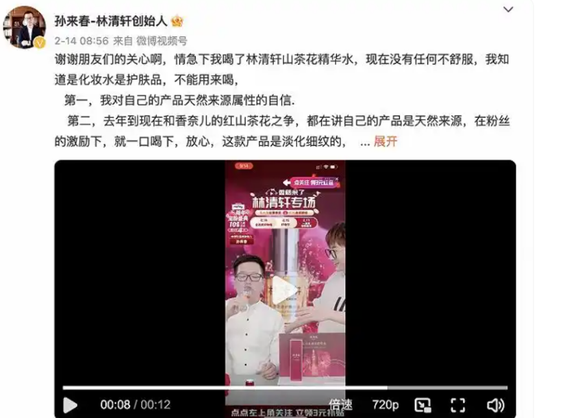 此前,在直播活动中孙来春介绍林清轩山茶花精萃水时,一口喝下了杯中的化妆水,引发了弹幕评论区的热议。