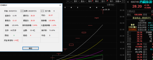 其中,西藏旅游的股价表现尤为突出,该股从7月21日开始,连续收获9个涨停板,阶段涨幅达到135.98%,成为近期市场连板数量最高的个股。截至7月31日收盘,西藏旅游涨9.98%,报28.20元/股。