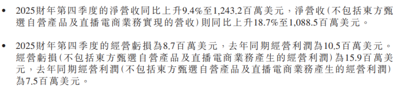 财报显示,不包括东方甄选自营产品及直播电商业务在内,新东方第四财季的净营收为10.89亿美元,同比上升18.7%;经营亏损约1590万美元,去年同期经营利润为750万美元。