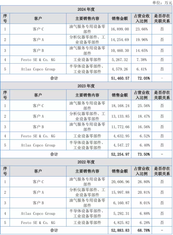 近年来,腾信精密重点深耕客户A、客户C、客户B、Festo、Atlas Copco等各领域的全球知名头部企业,导致客户集中度高。2022年、2023年、2024年,公司前五大客户收入占同期营业收入比例分别为68.78%、73.50%和72.05%。