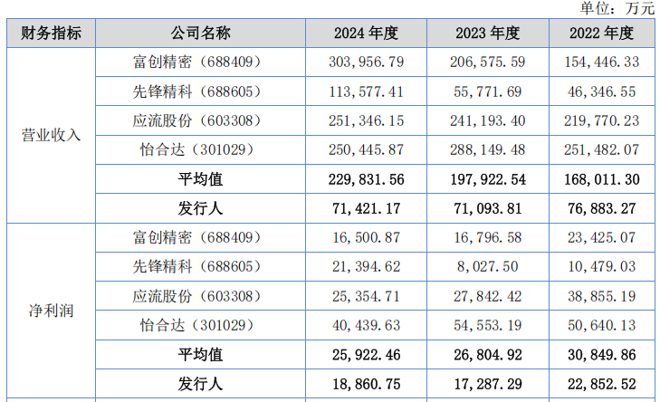 根据所处行业、主营业务和产品应用领域的类似性以及财务数据的可靠性和可比性,选取富创精密(688409)、先锋精科(688605)、应流股份(603308)、怡合达(301029)作为腾信精密的可比公司。