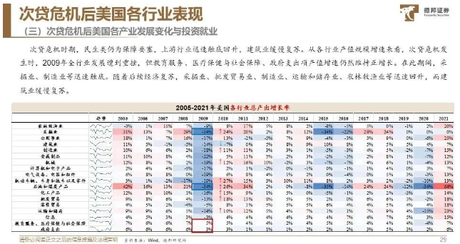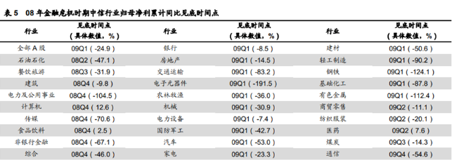 回顾当时国内的经济状况,当时就是城镇化率还有待提升,2008年时的城镇化率仅为45.68%,所以银行地产整体表现还行,在当时的政策下传统行业的复苏情况也是反转较快。我们到电力及公共事业仅09年的Q1就大幅收复失地,建筑一直没怎么差,食品饮料和医药一直都挺好,电力设备也很快收复失地等比较典型。其他的大家也可以具体看数据。
